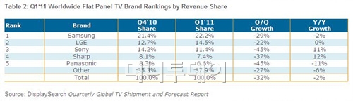 전분기 5위였던 샤프는 8.1%에서 7.4%로 0.7%포인트 하락했고, 4위였던 파나소닉은 8.3%에서 6.6%로 1.7% 포인트 감소하면서 양사는 1분기에 4, 5위 자리를 서로 바꿨다.