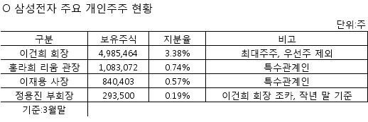 3월 말 현재 삼성전자 최대주주는 이건희 회장으로 지분율은 3.38%(우선주 0.05% 제외)다. 특수관계인 중에서는 삼성생명이 7.21%로 가장 많은 주식을 보유하고 있고, 삼성물산 4.06%, 삼성화재 1.26%, 홍라희 리움 관장 0.74%, 이재용 사장 0.57% 순이다.