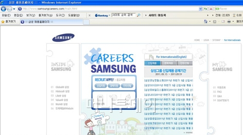 이번에 새 단장한 삼성 채용사이트는 기존 사이트와 달리 외국인도 사용가능토록 했고, '인사이드 삼성' 등 삼성을 소개하는 내용 등도 새롭게 추가했다.
