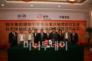 한화그룹은 14일 중국 닝샤(寧夏)자치구 링우시의 카이위에호텔에서 닝샤자치구 및 링우시와 태양광 발전설비 지원을 통한 사막화방지 협약을 체결했다고 밝혔다. 이 사업에는 UNCCD(유엔 사막화방지협약)도 함께 참여한다.