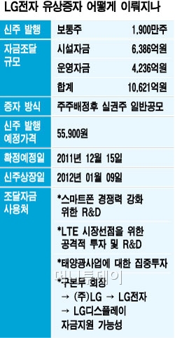 LG전자는 이날 이사회를 통해 6385억원의 시설자금과 4235억원의 운영자금 조달을 위해 유상증자를 결의했다고 밝혔다.