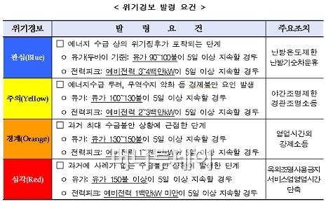 매뉴얼은 두바이유 현물가격에 따라 '관심→주의→경계→심각' 등으로 올라간다. 유가가 90∼100달러면 수급불안을 우려해 '관심'경보를 발령하고 100∼130달러대로 뛰면 고유가로 인한 무역수지 적자를 우려해 '주의'로 격상한다. 또 130∼150달러대를 기록하면 '경계'를, 150달러로 오일쇼크가 우려되면 '심각'경보를 발령한다. '심각'단계에선 공무원 자가용 운행이 제한되고 가로등이 소등되는 한편 대중목욕탕과 유원시설 등의 영업시간이 단축된다.