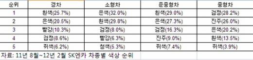 다만 소형차급에선 은색이 32%로 흰색(29.8%)을 앞섰으며, 중형차는 검정색이 28%로 진주색(26%)과 은색(20.2%)을 제치고 최고를 기록했다.