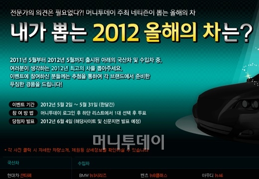 온-오프라인 경제뉴스를 선도하고 있는 머니투데이가 2012년을 빛낼 단 한대의 차종을 선정합니다.