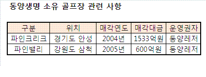 지난 2004∼2005년 동양레저는 골프장 2곳을 동양생명에 매각했지만 동양생명으로부터 사업권을 보장받았고, 동양레저가 원할 때 되팔아야 한다는 등의 조건이 달려 있는 것으로 확인됐다.