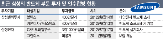 특히 지난 8월에는 영국 반도체 설계회사인 CSR사 모바일 부문을 3억1000만달러(약 3467억원)에 분할 인수했다. 외환위기 이후 삼성전자가 진행한 인수합병(M&A) 중 가장 큰 규모일 정도로 갈수록 보폭도 넓어지고 있다.