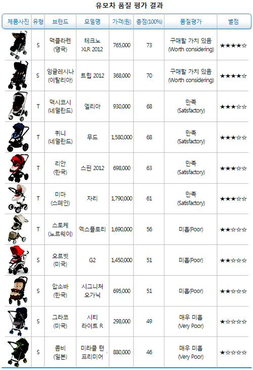 29일 한국형 컨슈머리포트인 비교공감 11호에 따르면 국내에서 인기가 높은 스토케의 익스플로리, 오르빗의 G2 등은 최근 한국, 영국, 홍콩, 스웨덴 등 6개국 소비자단체가 공동으로 진행한 유모차 품질비교검사에서 전체 6개 등급 중 네번째인 '미흡'(Poor) 판정을 받았다.