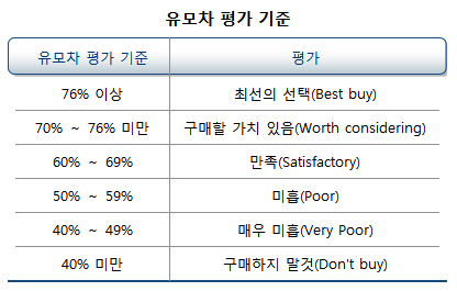 비교대상 제품 중 가장 비싼 미마의 '자리'(179만원)는 중간 등급인 '만족'(Satisfactory) 평가를 받았고 그라코의 '시티라이트R'과 콤비의 '미라클 턴 프리미에'는 비교대상 제품 중 가장 낮은 '매우 미흡'(Very Poor) 평가를 받았다.