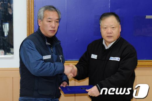 한진중공업과 금속노조는 이날 오후 1시10분께 부산 영도구 봉래동 영도조선소에서 '합의문 조인식'을 열었다. 노사대표는 사측이 노조를 상대로 낸 158억 손해배상소송과 고 최강서씨 장례문제와 유가족 지원 등 쟁점에 합의했다고 발표했다.