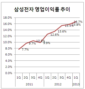 사상 최대 실적행진을 이어오던삼성전자(214,500원 ▼1,500 -0.69%)가 ‘1분기=비수기’라는 전자업계의 공식마저 무너뜨렸다. 스마트폰의 거침없는 질주와 반도체와 디스플레이 부문의 부활로 지난 1분기에도 사실상 사상 최대 실적을 기록했다.