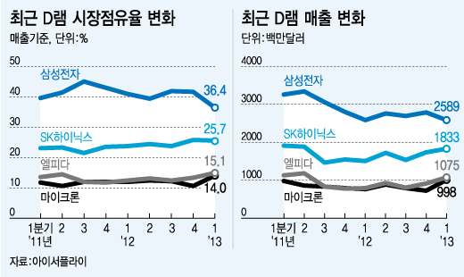 반면 D램 가격 상승 덕분에 삼성전자를 제외한 SK하이닉스, 엘피다, 마이크론의 매출과 시장점유율은 모두 올랐다. 특히 PC용 D램 생산 비중이 높은 마이크론의 시장점유율이 눈에 띄게 상승했다.