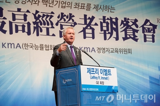 제프리 이멜트 제너럴일렉트릭(GE) 회장이 24일 서울 하얏트호텔에서 열린 제483회 KMA 최고경영자조찬회에 특별 강연자로 나서 리더십에 대한 견해를 밝혔다.