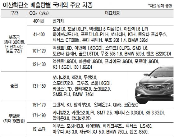 정부 관계자는 "저탄소차협력금제도는 CO₂과다배출·에너지과소비형 경제구조를 저탄소·에너지절약형으로 전환하자는 취지"라며 "제도의 취지를 살리되 국내 자동차산업의 파급효과도 함께 고려해 초기 중립구간 기준을 쏘나타·K5로 설정할 계획"이라고 설명했다.