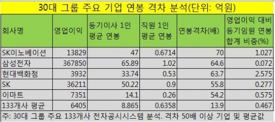 1일 머니투데이가 사업보고서를 공시한 30대 그룹의 주요계열사 133개사 등기이사 연봉과 직원들의 연봉을 조사한 결과 이같이 나타났다.