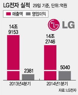LG전자(108,300원 ▼500 -0.46%)는 올 1분기 연결기준 매출액이 14조2746억원, 영업이익은 5040억원을 기록했다고 29일 공시했다. 2012년 2분기(5267억원) 이후 분기 최대 영업이익 기록이다.