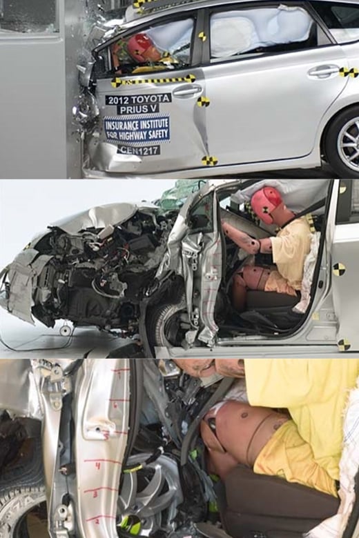 첫 번째 사진이 스몰오버랩 테스트에서 Poor를 받은 도요타 프리우스이고, 두 번째 사진이 Good 등급을 받은 아우디 A3 신형세단 모델입니다. 실제 사고라고 생각해 보면 끔찍한데요.