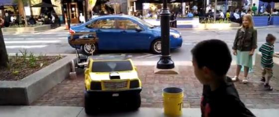 이 영상 속 '범블비'는 아쉽게도 실물 사이즈의 로봇이 아닌 거리 공연을 하는 사람이다.