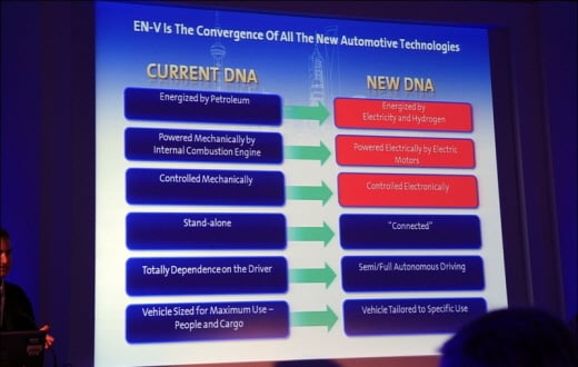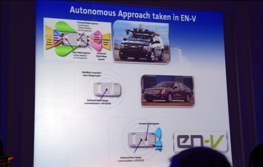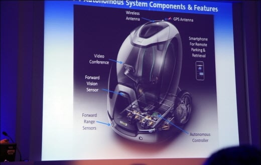 어쨌든 GM은 'EN-V'라 불리는 미래 자동차 모델을 만들었습니다. 두 명이 탈 수 있는 차체에는 다른 자동차와 소통하도록 통신장비와 무인주행을 위한 센서 등 각종 첨단장비가 들어갑니다. 단순하지만 갖출 건 다 갖췄다는 얘기죠.