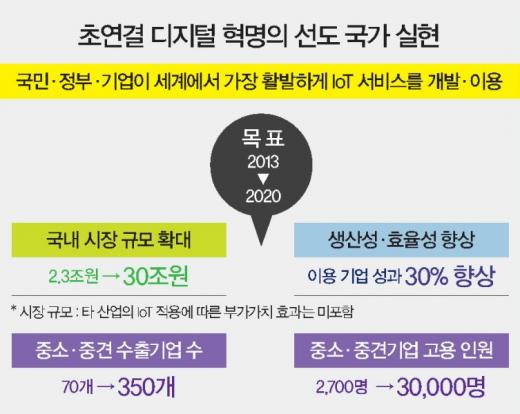 이 비전 실현을 위해 4가지 목표를 설정했다. 이 목표는 2020년까지 국내 IoT 시장 규모를 현재 2조 3000억원에서 30조원으로 확대하고 생산성 및 효율성을 30% 향상시키며, 중소·중견 수출 기업 수는 70개에서 350개로 늘리고 고용 인원을 2700명에서 3만 명으로 증가시키는 것이다.
