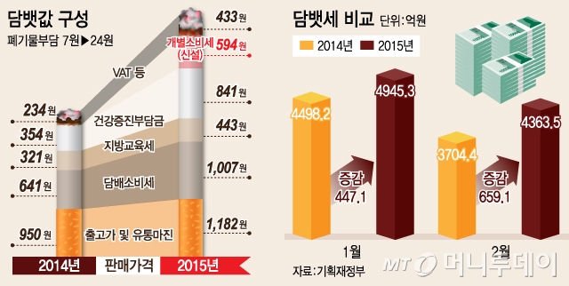 담배출고량은 절반으로 줄었지만 정부가 걷어 들인 세금은 약 1000억원 가량 늘었다. 올 1월1일부터 담뱃세가 인상됨에 따라 소비세 1007원, 지방교육세 443원, 건강증진부담금 841원, 개별소비세 594원, 부가가치세 409원, 폐기물부담금 24원이 부과되는데 이중 부가세를 제외한 2909원이 출고 시 부과된다. 담뱃세 인상 전인 지난해까지는 출고할 때 1323원의 세금이 부과되고 판매 시 227원이 부과됐다.