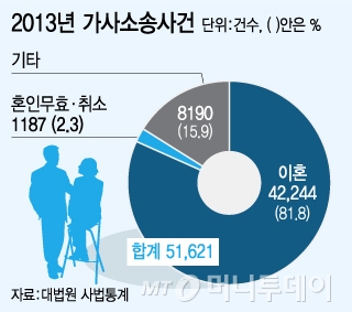 대법원 통계에 따르면 2013년에 접수된 가사소송사건은 총 5만1621건. 이혼이 4만2244건으로 가장 많고, 혼인 무효·취소는 1187건으로 2.3%에 그친다. 혼인 무효·취소에서 원고가 이긴 경우는 529건으로 승소확률은 44.6%다.