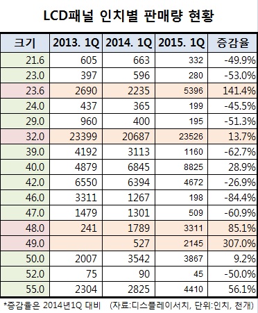 11일 시장조사업체 디스플레이서치에 따르면 올 1분기 TV용 LCD(액정표시장치) 패널 판매량은 23.6, 32, 48, 49, 50, 55형 제품에서 증가세가 두드러졌다.