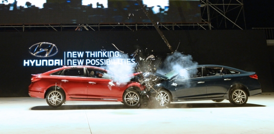 곽진 현대자동차 국내영업본부장(부사장)은 지난 22일 인천 송도에서 세계 최초 '차 대 차'(車對車) 야외 공개 충돌테스트 시연을 성공적으로 마친 뒤 만족스러운 표정을 지었다.