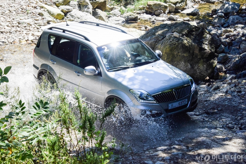 티볼리가 연료 효율성과 튀는 디자인으로 '도심형 SUV'를 표방했다면 렉스턴은 오프로드 성능을 강조하며 '뼛속까지 SUV'를 콘셉트로 잡았다. 쌍용차가 차량 출시 후 연 첫 행사도 오프로드 시승회다. 지난 7일 산악자전거(MTB), 오프로드 자동차 마니아에게 잘 알려진 경기 가평의 칼봉산 자연휴양림 산기슭 도로에서 이뤄졌다.