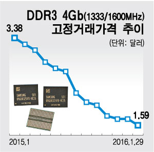 통상 미세공정 기술 발전 등으로 생산성이 향상되면서 매년 D램 가격이 30~40% 이상 떨어지는 현상은 당연하다. 다만 작년부터는 하락속도가 빨랐다. DDR3 4기가비트(Gb) 제품의 경우 작년 9월 초만 해도 2.3달러에 육박했지만 올 들어 1.8달러대로 추락했다.