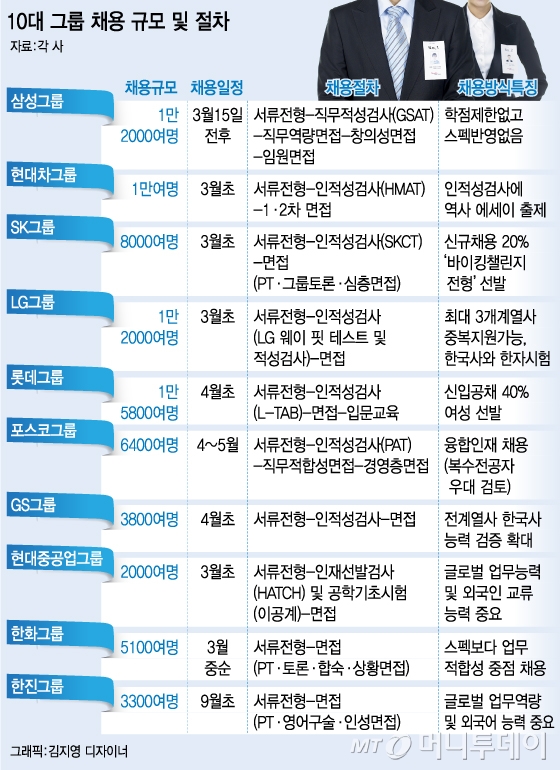 올해 대기업 채용 시즌이 본격 시작된다. 10대 그룹을 포함한 국내 대기업들은 내달초 채용 공고를 내고 신입 대졸 공채에 나선다. 올해 취업문은 작년보다 더 좁아치고 채용 절차는 더 까다로워졌다.