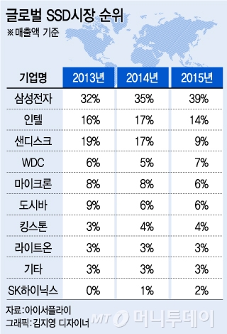 2위 인텔(2014년 17%→ 2015년 14%)과 3위 샌디스크(17%→9%) 등 시장 내 주요 플레이어들이 시장을 빼앗기고 있는 것과는 극명히 대조되는 모습이다.