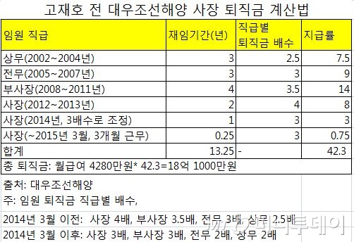 17일 머니투데이가 확인한 대우조선해양 임원퇴직금 지급 규정에 따르면 이 회사는 2014년 3월 이전까지는 사장 4배, 부사장 3.5배, 전무 3배, 상무 2.5배의 퇴직금 지급비율을 정하고, 이 비율에 퇴직전 3개월 평균급여와 근속연수를 곱해 퇴직금을 지급해왔다.
