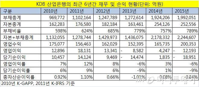 '2015년 종업원 1인당 당기순손실 5억 4000여만원, 부채비율 789%, 총자산순이익률 -0.98%.'