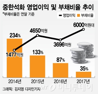 부채비율도 큰 폭으로 떨어졌다. 2014년 말 234%에 달했던 부채비율은 15년 말 133%, 16년 말 87%에 이어 지난해에는 35%까지 낮아졌다. 번 돈으로 부채를 줄이고, 낮은 부채비율이 다시 수익성을 끌어올리는 등 선순환을 하는 셈이다. SK의 고도화된 설비 운영 노하우가 시노펙이 보유한 풍부한 자원 등과 시너지를 내고 있는데다 저유가, 화학업계의 누적된 투자 부진 등이 맞물리면서 꾸준한 수익성을 유지하고 있다.