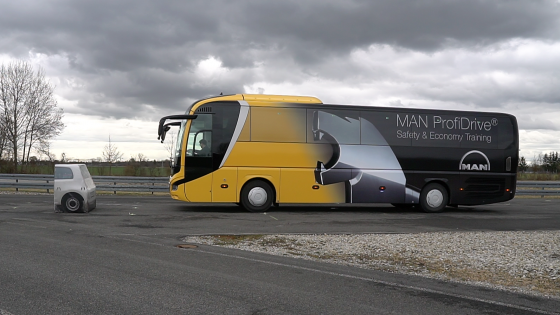 만의 운전자교육시스템 '프로피 드라이브'(PorfiDrive)를 통해 '만 라이온스 코치' 대형버스를 타고 긴급제동시스템(EBA)을 직접 체험해봤다.