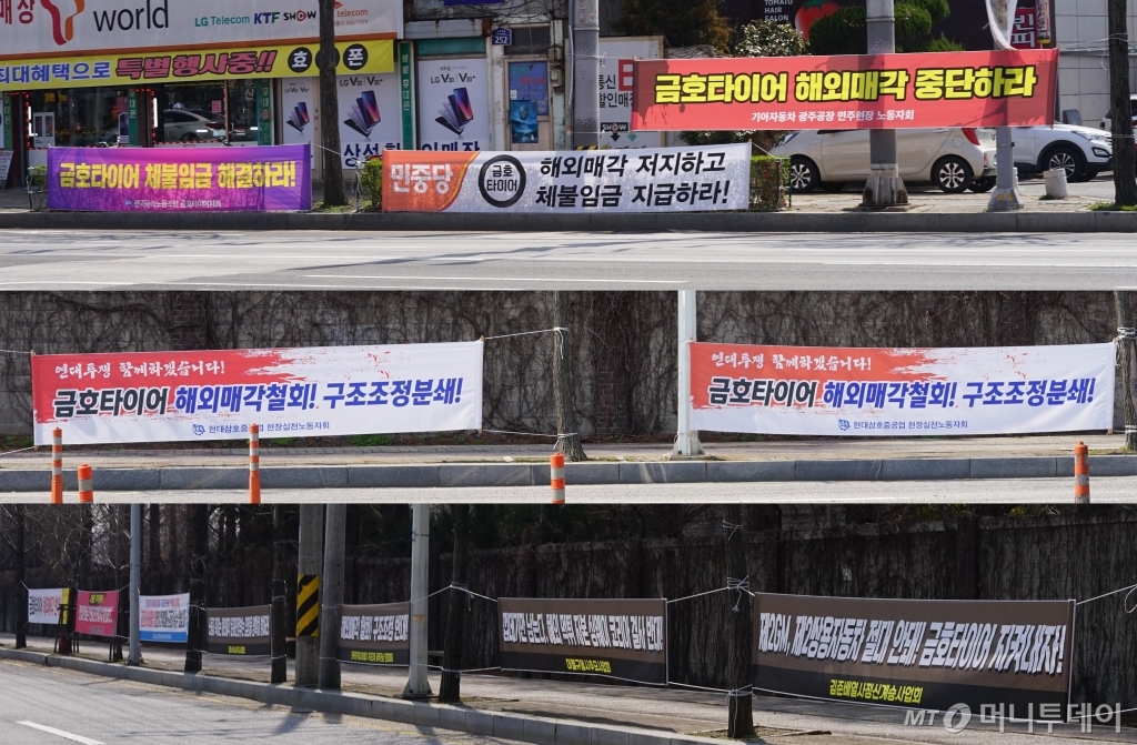 ◇석달째 밀린 월급…일반직 설명회 방해에 경찰까지=27일 찾은 광주공장은 KTX광주송정역 바로 옆이다. 담장을 돌아 걸어가는 길 곳곳에 ’금호타이어 해외매각 반대‘ 현수막이 걸려 있었다. 근처 영통사거리에는 노조간부가 고공농성을 벌였던 송신탑이 있었다. 고공농성이 끝난 후 송신탑 중간의 펜스가 철거됐다. 고공농성 재발을 막기 위해서다.