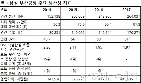 부산공장은 2010년 27만5000대까지 생산하다 2013년 12만9000대까지 반토막 이상 곤두박질 친 적이 있다. 막대한 적자까지 내며 매각설이 돌았다. 그러자 2014년 얼라이언스 차원에서 수출용 닛산 로그 프로젝트를 맡겼다. 여기에 혼류 시스템으로 생산량을 탄력적으로 운영해 설비 투자 비용·시간을 최소화하면서 다시 3년 만에 전성기 시절 수준을 회복했다.