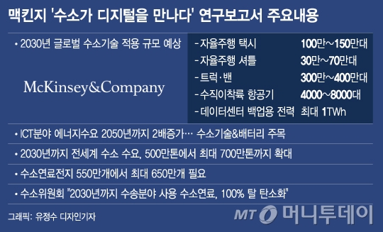 그러나 이들은 △장거리 고정노선이 있는 대중교통 △트럭 등 대형 수송·물류 분야 △수직이착륙 항공기 등 대규모 교통 수요에서 수소전기차가 현재의 디젤차를 대체할 수 있는 경쟁력을 유일하게 갖춘 것으로 평가했다. 수소전기차는 배터리 전기차 대비 '에너지 밀도(energy density)'가 높고, 충전이 쉽고 빠르기 때문이다.