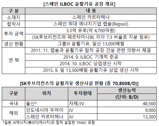 두 회사는 SK루브리컨츠가 윤활기유 생산 기술과 글로벌 마케팅 네트워크를 제공하고, 렙솔이 현지에서 원료와 인프라를 제공하는데 합의했다. SK와 렙솔은 7대 3의 지분 비율로 총 3억3000만 유로(한화 약 4700억원)를 투자했다. 합작사인 일복의 생산기지는 2012년 10월 착공해 2014년 10월부터 상업생산을 시작했다.