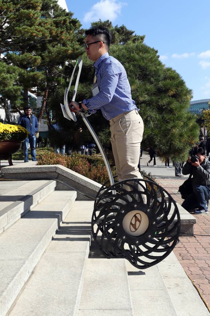 #현대·기아차 연구원이 퍼스널모빌리티(1인용 운송수단)를 타고 계단을 올라가자 모두 탄성이 터졌다. 퍼스널모빌리티가 가진 최대의 장애물을 극복한 셈이다. 휠체어에 적용해도 될 만큼 완성도가 높았다.