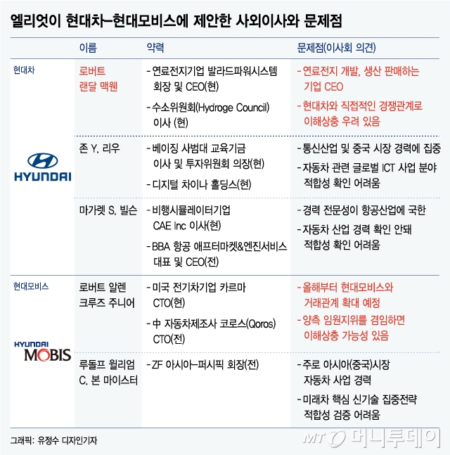 미국계 헤지펀드 엘리엇 매니지먼트가 경쟁사의 회장 겸 CEO를 현대차 사외이사로 제안해 논란이 일고 있다. 해당 기업은 현대차의 핵심 신성장동력인 수소연료전지를 만드는 업체다. 또 현대모비스에는 고객사 임원을 사외이사로 추천해 인사 검증에 한계를 드러냈다.