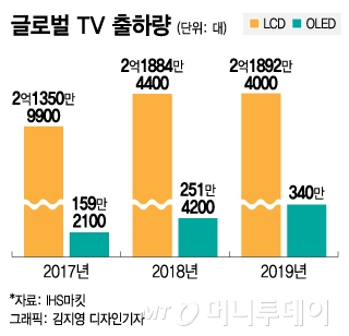 LG전자의 경우 'OLED 올인' 전략에 따라 LCD TV 출하량은 2015년 2810만대, 2016년 2650만대, 2017년 2500만대, 2018년 2530만대로 하향곡선을 그렸다. 올해는 연간 출하량이 2700만대로 늘어날 것으로 예상된다.