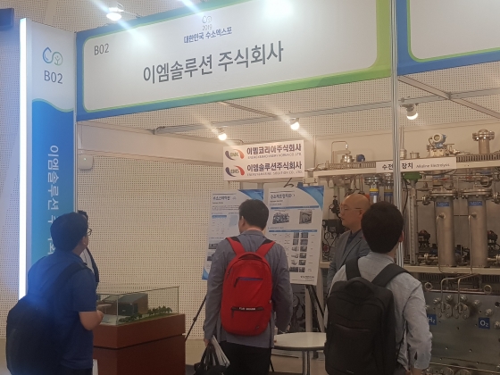 물을 수소와 산소로 전기분해하는 '수전해 장치'를 선보인 이엠솔루션도 호기심을 자아냈다.