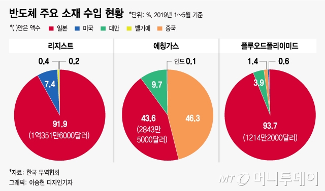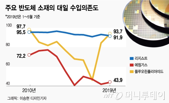 일본 정부가 수출 절차를 강화한 포토리지스트, 고순도 불화수소, 플루오린 폴리이미드는 모두 일본 의존도가 큰 소재다. 한국무역협회에 따르면 올 들어 지난 5월까지 반도체 기판 제작 때 쓰는 감광제 리지스트와 휘어지는 OLED(유기발광다이오드)의 재료인 플루오린 폴리이미드는 90% 이상을, 반도체 세정에 사용하는 에칭가스(고순도불화수소)는 40% 이상을 일본에서 수입했다.