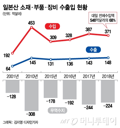 지난해 대일 무역적자 241억달러 가운데 소재·부품·장비 적자는 224억달러에 달한다. 전국경제인연합회(전경련) 산하 한국경제연구원 조사에 따르면 일본 수출규제로 국내 대기업의 매출과 영업이익이 각각 평균 2.8%, 1.9% 줄어들 전망이다.