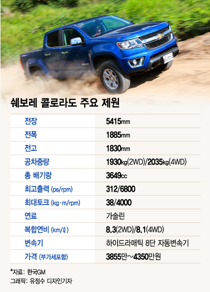 변속기는 하이드라매틱 8단 자동변속기가 탑재됐다. 복합연비(2륜 구동)는 8.3㎞/ℓ, 배기량은 3449㏄, 유종은 가솔린이다. 가격은 3855만~4350만원. 미국차 특유의 무난한 내부 인테리어가 아쉽지만, 콜로라도는 '정통 아메리칸 픽업트럭'의 값어치로 충분하다.