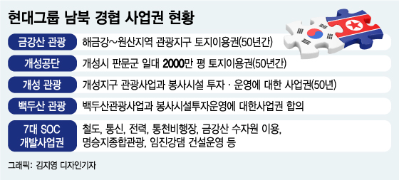 현대그룹은 금강산 사업과 관련, 1998년부터 해금강-원산지역 관광지구 토지이용에 대한 50년 사업권을 보유했다. 올해 초 하노이 북미 정상회담 전까지 남북 경협의 첫 단추는 현대가 사업권을 가진 금강산 관광 재개라는 말이 나올 정도였다.