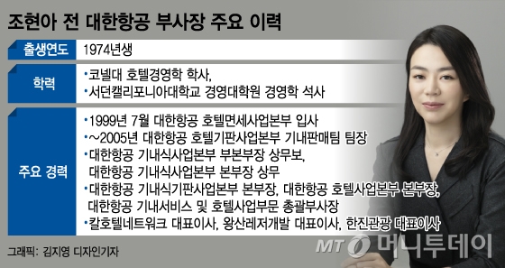 조 전 부사장은 미국 코넬대학교에서 호텔경영학을 전공했다. 1999년 대한항공 호텔면세사업본부로 입사해 호텔사업본부장을 맡았다. 조 전 부사장이 2009년