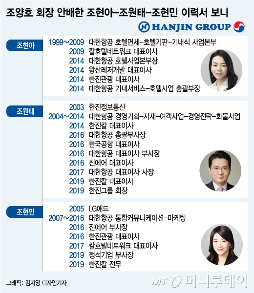 반면 조현아 전 부사장은 호텔, 케이터링 같은 서비스 영역을, 막내딸 조현민 한진칼 전무는 마케팅 분야에서 실력을 쌓게 했다.