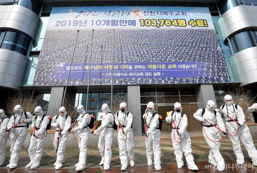 ![[대구=뉴시스] 이무열 기자 = 신종 코로나바이러스 감염증(코로나19) 확진자가 376명 추가돼 총 3526명으로 늘어난 1일 오후 대구 남구 대명동 신천지 대구교회 앞에서 육군 제2작전사령부 소속 19화생방대대 장병들로 구성된 육군 현장지원팀이 방역작전을 펼치고 있다. 2020.03.01.lmy@newsis.com](https://thumb.mt.co.kr/cdn-cgi/image/f=avif/21/2020/03/2020030815143482749_1.jpg)